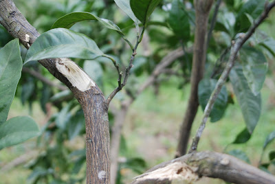 | サルはタチが悪い。ミカンを食べるだけでなく、枝もこんな感じでボキボキ状態。 |