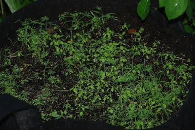 40cm程の袋に、雑草とともに多数出ているのがディルの芽だ。