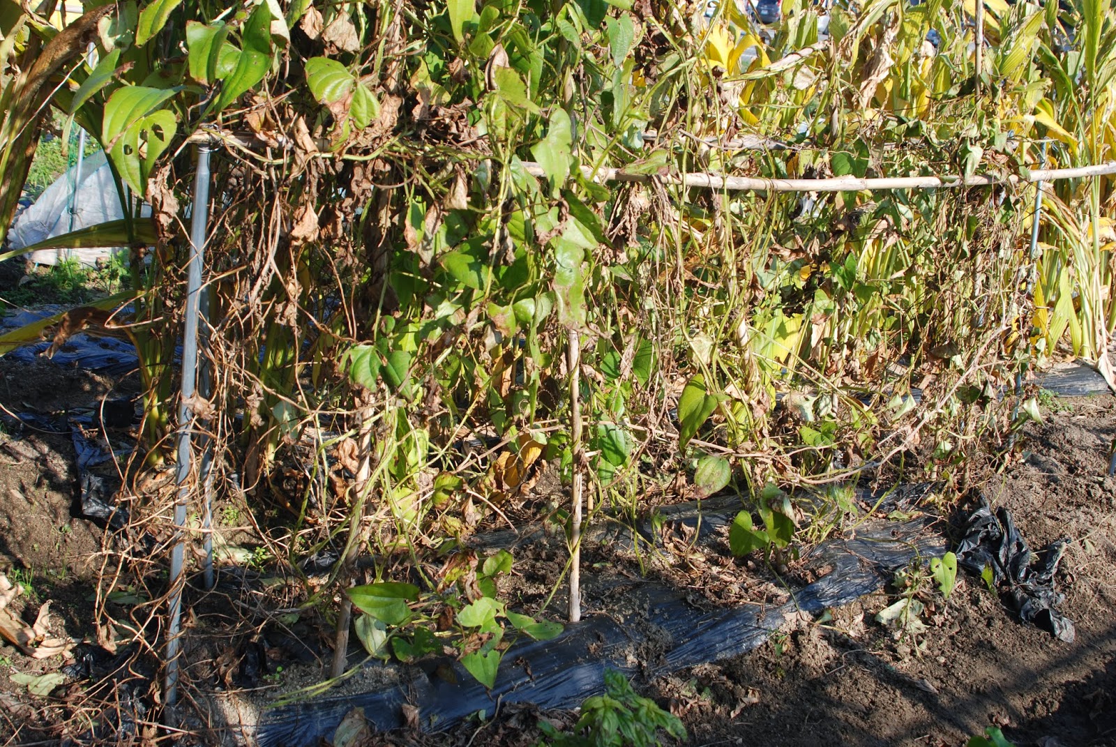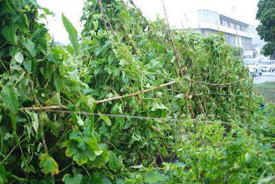 | これだけ蔓葉が茂って、支柱も台風に堪えた。 となると、かなりの収穫を期待していたのだが。 |