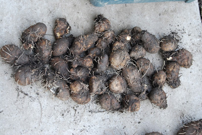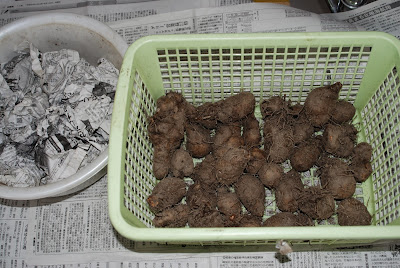 | この中の半分くらいが食べれる大きさまで成長してくれていれば嬉しかったのだが….。 これまでに確保していたものと合わせると、今のところ種芋用に確保出来た芋は40個くらいある。 来年3月の時点でこれらの中から24個の状態の良いものを、厳選して植えようと思っている。 |