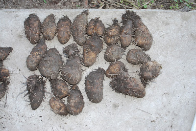 | 右端は種芋。食べれる大きさの芋を5個収穫 |