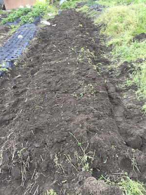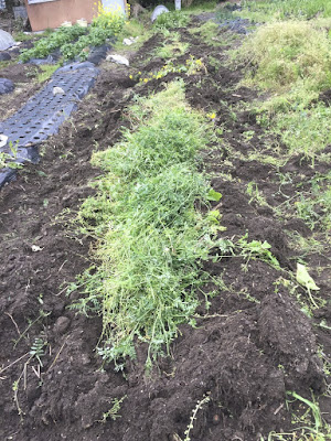 で、畝を作るときには、真ん中に深めの溝を掘って、こんな雑草と収穫を終えた野菜を埋め込んでおいた。