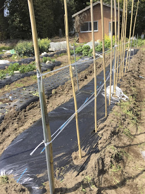さらに、鉄パイプを8本立てて固定用の支柱とし、その間に竹支柱を立てていった。