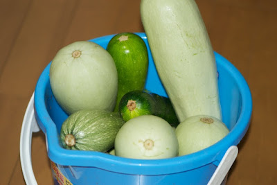 | 日曜、月曜と2日置いただけで、大きなズッキーニがたくさん収穫出来た。 そのほとんどが白ズッキーニだ。 |