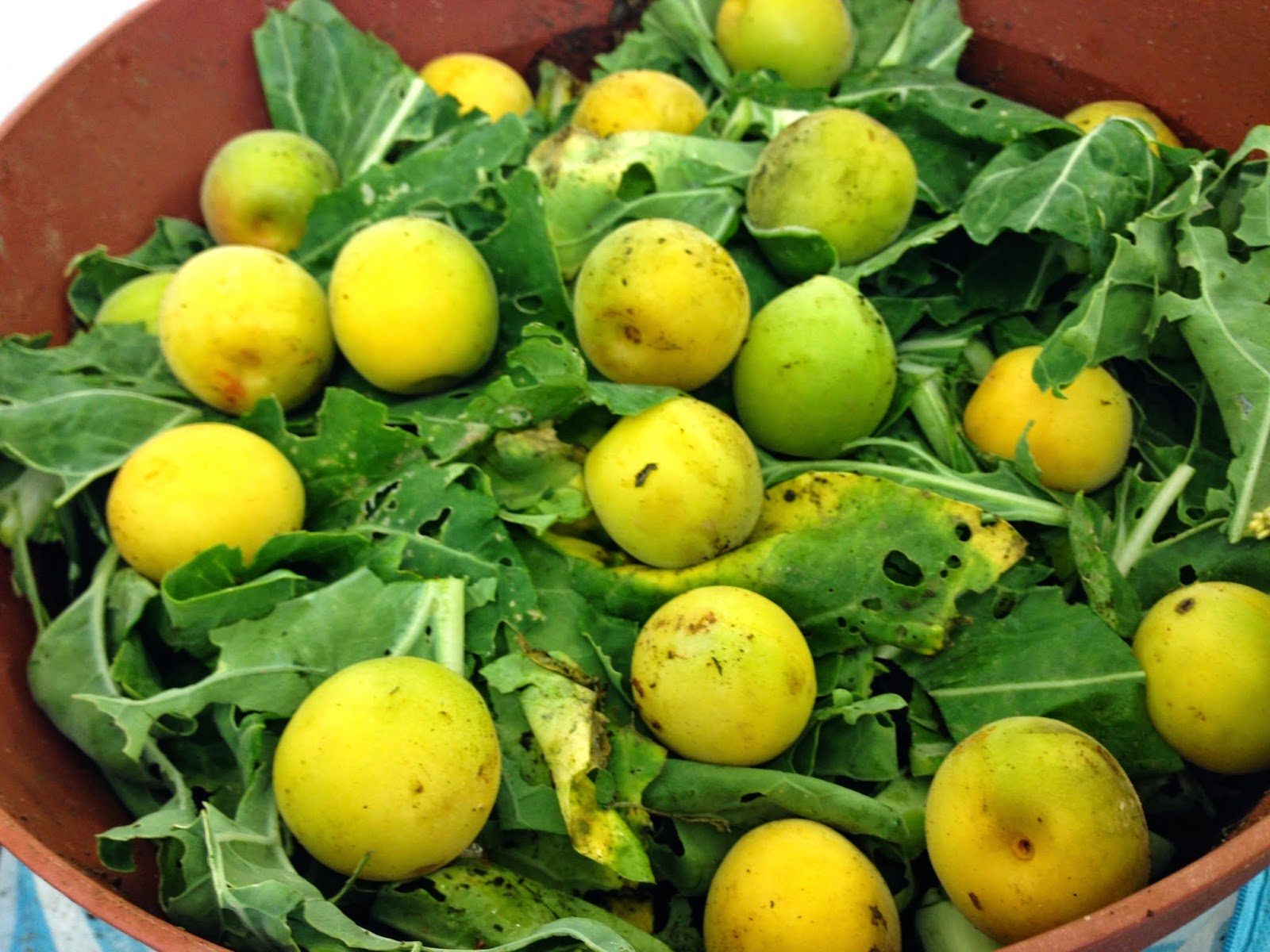 | この時期の落ち梅は大きい。 ミミズ小屋(どんぶり3号)が小さく見える。 梅と一緒に入っている餌はアオムシに食べられたスペインキャベツ。 |