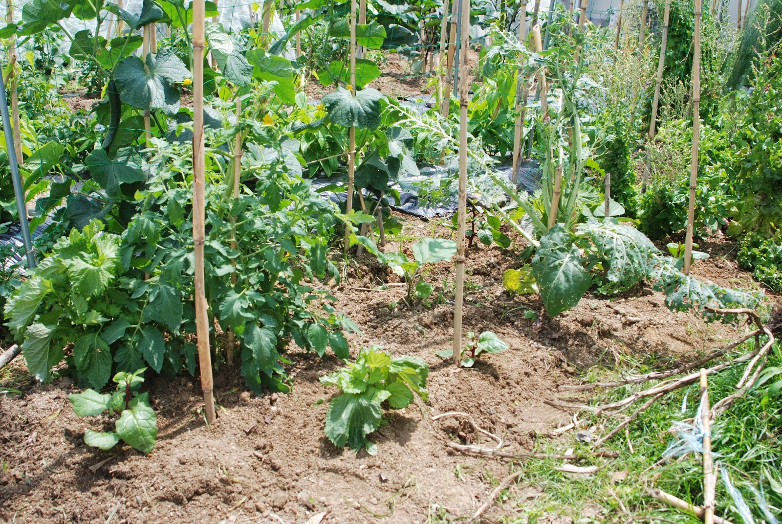| この一画は、キュウリやインゲンなどの蔓植物が育っている。 この一画の片隅にツルムラサキの自然発生苗を4本程移植してきた。 |