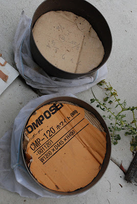 | これが中の段のプランター。ボリューム的にはまだまだ満杯とはいかない。表面においたココナッツ繊維は乾いている。乾いたココ繊維を剥いでみるとまだ食べ切っていないウェットな食材の中にみみず君がウヨウヨ居た。 |