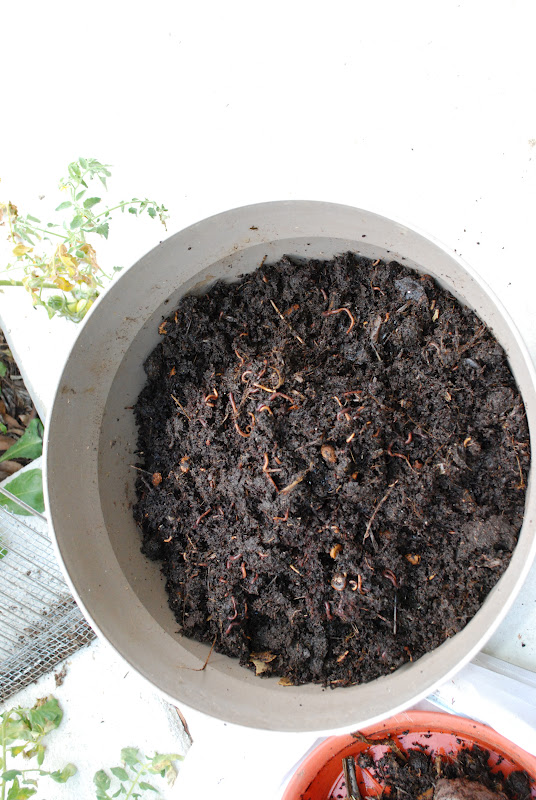 | 下の段。堆肥以外に十匹程のみみず君と梅の種が多数見受けられる。 |