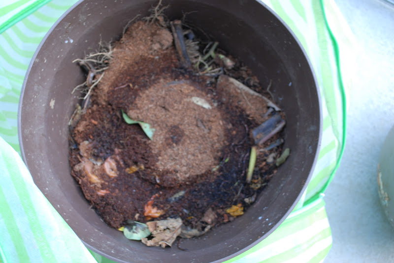 | これが中の段のプランター。ボリューム的にはまだまだ満杯とはいかない。表面においたココナッツ繊維は乾いている。乾いたココ繊維を剥いでみるとまだ食べ切っていないウェットな食材の中にみみず君がウヨウヨ居た。 |