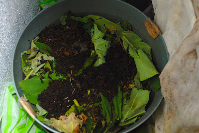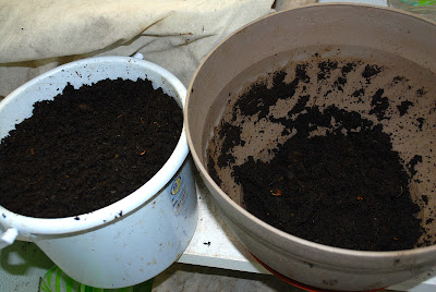 堆肥はバケツ1杯収穫して右のプランターにはまだ少し余っている。最終的にバケツ1杯と1/4の収穫があった。