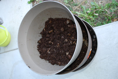 どんぶり型3段重ねのミミズ小屋、10月18日、最上段に冷凍解凍後のキクイモを入れて3段目がスタートした。その後。最上段にどんどん餌を足していった。