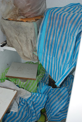 | 緑の袋に入っているのが1号3段。青の袋に入っているのは2号から4号までの3段ミミズ小屋。これらはまだ2段目の餌入れをおこなっている最中だ。それにしても1畳程の狭い作業場がいよいよ狭くなってしまった。 |