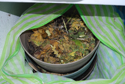 | 緑の袋に入っているのが1号3段。青の袋に入っているのは2号から4号までの3段ミミズ小屋。これらはまだ2段目の餌入れをおこなっている最中だ。それにしても1畳程の狭い作業場がいよいよ狭くなってしまった。 |