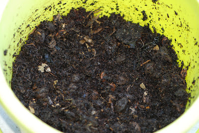 | 上の写真は堆肥分別途中のバケツの中:一旦バケツの中に移した堆肥とミミズと残った餌を適当量小皿に移し、分別していく。堆肥の状態やミミズ君の状態がよく観察出来るのはいいのだが、小さいミミズが多かったり堆肥がウェット気味だと結構分別が面倒になる。 |