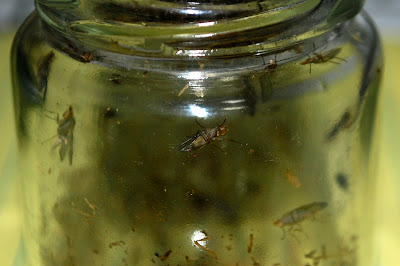 初めは下の写真の赤い物体が卵かサナギか分からなかった。当ブログを見て頂いたMatsumuraさんから、「赤いフットボール型のものは、卵ではなくて恐らく小バエのサナギでしょう」というコメントを頂き、それを確かめるために瓶の中で孵化実験をおこなったのだ。