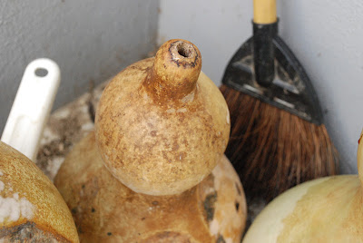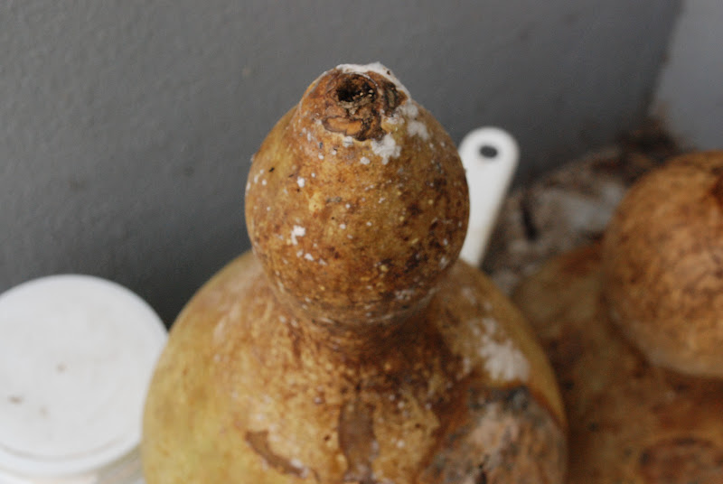 | 逆さに置いていたひょうたん。少しカビがついているがこの数日液が出てないのでしばらく普通の方向に置いておくことにする。 |