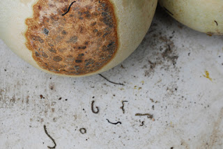 成長具合がよくわかるように子供みみずを入れていたが、予定外にひょうたんの外に出てきたのだ。もちろん外に出てきたみみず君は干物になる運命だ。このみみず君の脱出劇は中の果肉が腐り始めたサインのある2個のひょうたんの1個からのみ認められた。閉ざされた空間でウェットになり、みみず君にとって不得意の嫌気性菌感染などが起こってきたのかもしれない。とにかくこのひょうたんは投入した子供みみず君にとって居心地が悪かったことだけは間違いなさそうだ。