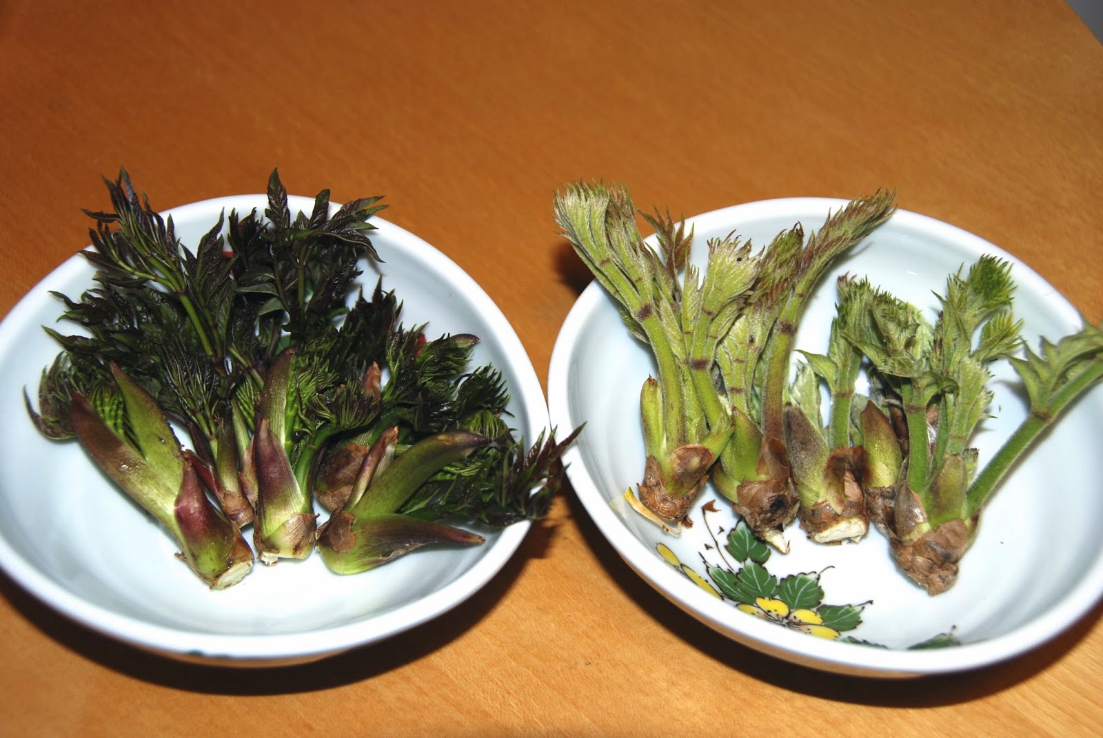 | 左が栽培種。右が天然もののダラの芽。 “ふかし”たものと、そうでないものは区別がつかなくなった。 |
