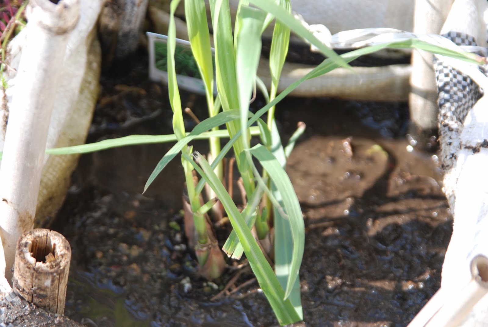 | 腰水法をおこなっているプランターの中の土嚢袋はべちょべちょ状態。 通常の野菜はとても育ちそうにない環境だ。そこにレモングラスの苗を植えてみた。 田んぼに稲を植えたのと同じような状態だ。同じイネ科で無事育つことを期待しよう。 |