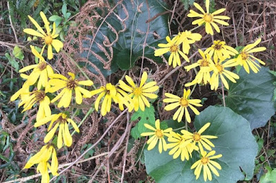 今の時期の果樹園では、ツワブキがいっぱい花を付けている。