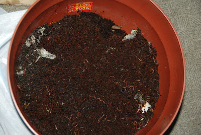 これは縦コンの受け皿。縦コンのミミズが過密になってきたためだろうか?この中に400匹くらい逃げ込んでいた。 |