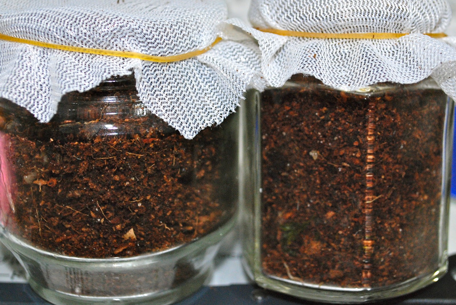 | これが設定した観察小屋(左が4a、右が4b)。外から餌は見えてないが左の方は容器全体の大きさに対し、餌はボリューム的に結構占めている。今、写真に見えているのはベッドとして用いたココナッツ繊維。いつものことだが実験設定直後は恥ずかしがり屋のみみず君たちは外から見えないところに隠れている。 |