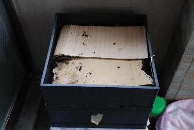 2段目の新しく金子1号になる箱の中央部分に、餌と上の段の食べ残しを重ね、その部分がが上の箱に接するようにしてみみず君の移動が容易になるようにする。