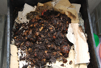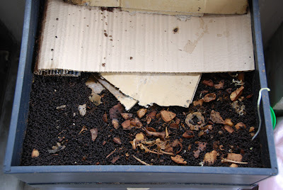 蓋のダンボールを一部外してみると、餌はまだ残っているが、堆肥はしっかり出来ている。