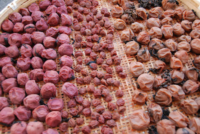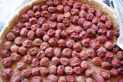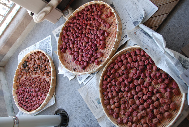 こちらは大梅、小梅、それにザルのスペースが足りなくて去年干せなかった梅(写真右)