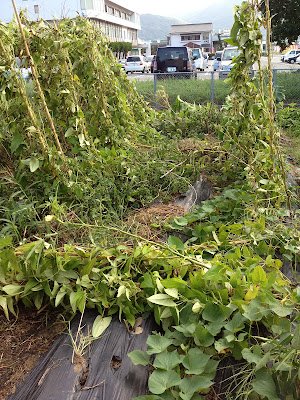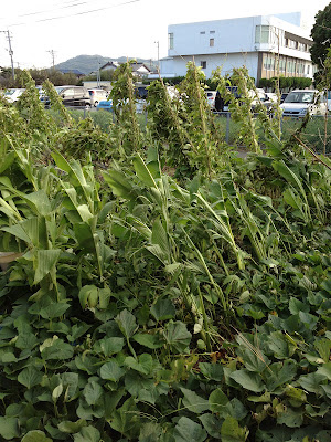 我が家の畑の方に目を移すと、先日支柱を立てた植木は大丈夫だったが、ツクネ芋に立てていた竹支柱が何本か折れ、他の野菜もそれなりの被害があった。