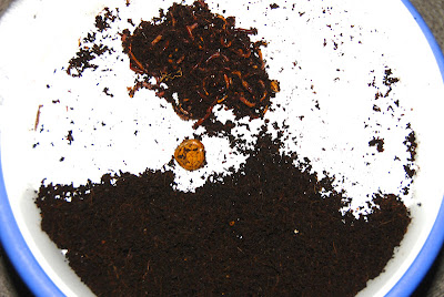 皿の上に広げてみると、みみずはめちゃくちゃ元気。堆肥の状態はかなり良い。ドライでもないしウェットでもない。もちろんカボチャの実や皮のかけらもない。