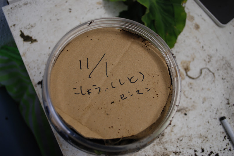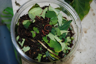| 上のスペースでみみず君が憩えるように里芋の葉をちぎったものを共有スペースに入れている。 みみず君には20匹に参加してもらった。 |