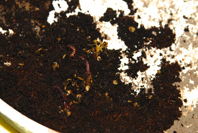 | 緑のトウガラシに中にはまだ全く食べられてない青い実や赤い物も混じっていた。 ミミズ君が8匹居たのは食べれる物が一番多く残っていたからだろうか?それともこんな寒い日にはトウガラシ食べてみみずくんも暖かくなる? |