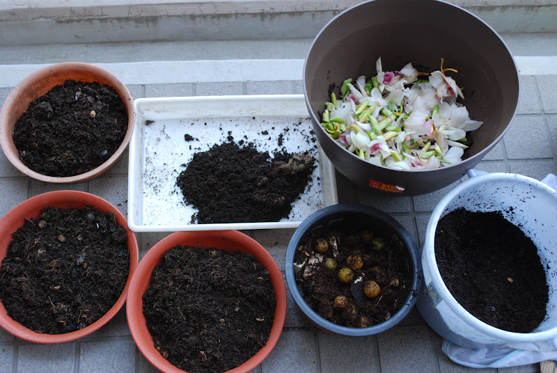いくつもの皿に分け,しばらく光に当てて,上の方のミミズの居ないところから堆肥を収穫し、下に固まったミミズを分別。
