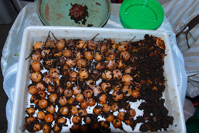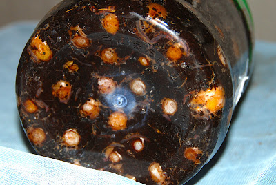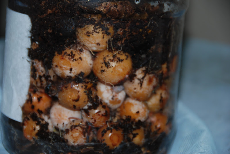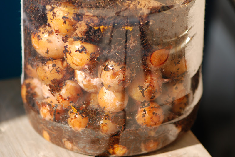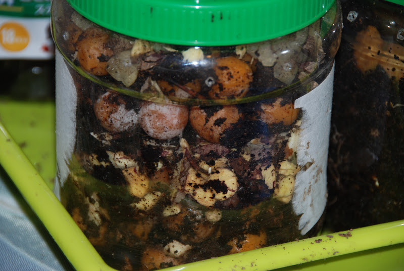 そこで、サツマイモなどミミズ君が元気になりそうな餌をサンドイッチ状態で入れ、銀杏は入っていたのと逆の配列(小さい方を上にして)で入れてみた。もしこれで下の銀杏が小さくなるようだったらミミズ君が何らかの関与をしているのだろう。