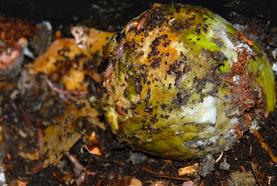 | カビも生えてきたがくぼみの中に数匹のミミズが入って明らかに冬瓜を食べているのが見える。 |
