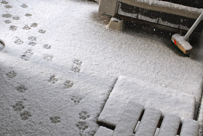 | 我が家のバルコニーも真っ白、こんな雪では北陸の方に笑われてしまいそうだが、珍しい雪を見て我が家の犬も喜んで飛び出した。 |