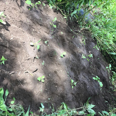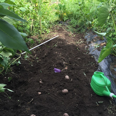この畝の手前の方には、収穫忘れの春ジャガで生き残っていたものを、そのまま種芋として植えておいた。