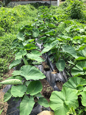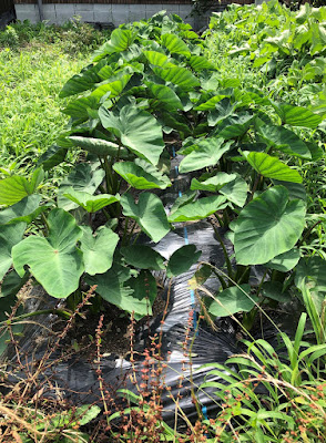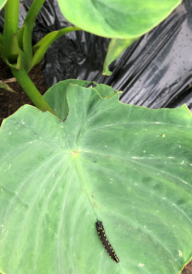 里芋の葉には毎年芋虫(セスジスズメの幼虫)が現れ、葉を食い荒らすので、時々見回り隊(私)が捕殺するようにしている。