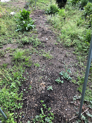 | 狭目の畝だが、小さな芋なので20cm間隔で4列に植えていった。 第1菜園のアスパラを育てていた畝の1/3は他の畝へと変わった。 |