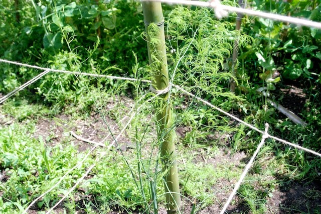 背を伸ばしたアスパラが倒壊すると病気になり易くなるらしい。