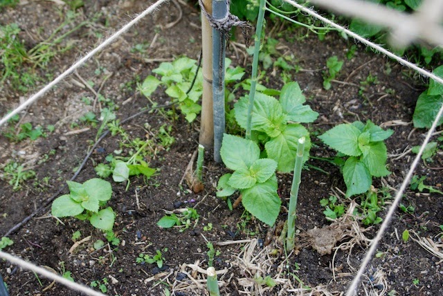 アスパラの根元付近にはたくさん青シソの芽が伸びてきているので、数本を残して間引きしておいた。