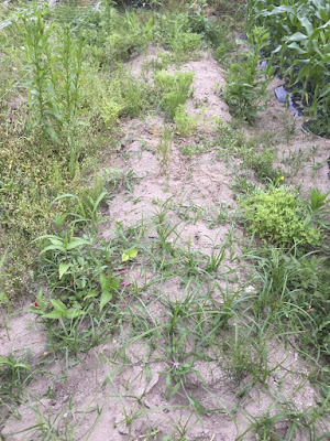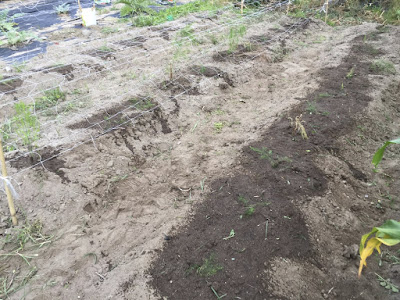 | この畝だけでも10種類くらいの雑草が生えていた。 小さな畝が3列あるのいだが、1列だけはアスパラネットを張る時間がなかった。 |