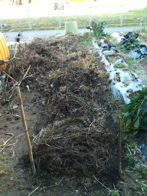 さらに、これから寒い日が続くので枯れ草や枯れ草堆肥を上にかけて防寒しておいた。