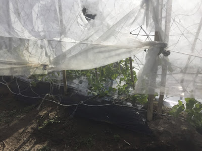 穴だらけになってきたエンドウ豆の防寒防風の不織布が痛々しい。