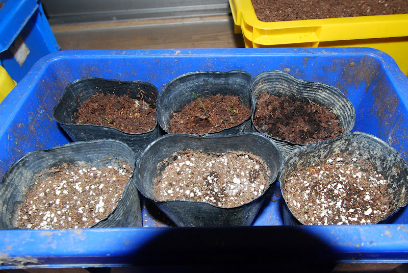 見にくいが奥のミミズ堆肥の方は10本程芽が出ている。