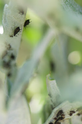 この苗にもアブラムシがたくさんいたのだが、近づいてみると羽根が生えたアブラムシが混じっていた。