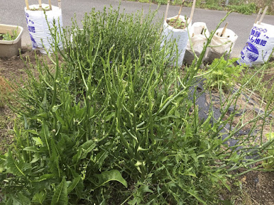 | こちらはプンタレッレのみを植えている場所。 美味しかった花芽の収穫も終わり、今はたくさんの小さな花が蕾の状態だ。 宿年野菜でも、この場所のプンタレッレの苗は片付けないといけないかもしれない。 |