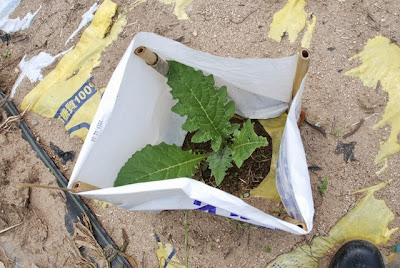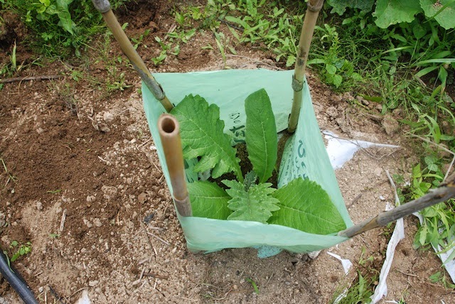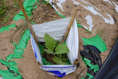 こちらは苗移植の時ビニール袋で風よけあんどんを作り、脇には防草シートを敷いた。 |