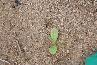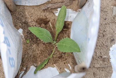 そのうち7本が芽を出した。半分育てば御の字と考えていたので、喜んでいたら、虫に食べられたり原因不明で倒れたりして、今は下の写真の3本しか出て来た苗は残っていない。